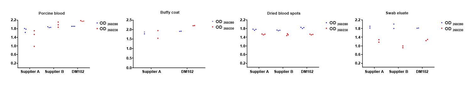 For DBS and swab samples, DM102 achieves purity levels comparable to Supplier A and Supplier B. It is important to note that when DNA concentrations are below 50 ng/μl, lower OD260/230 values do not indicate poor purity; this is expected and should not be used as a reference indicator.