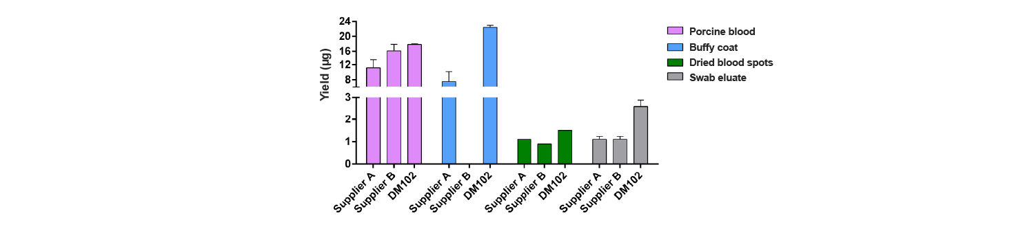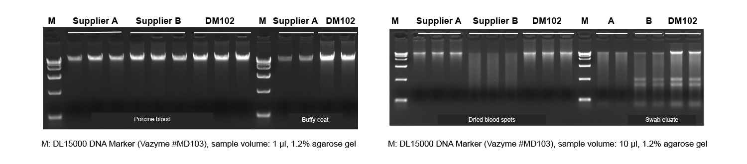DM102 consistently delivers higher DNA yield than Supplier A, Supplier B, and Supplier C, regardless of sample type. For laboratories seeking stable and reproducible output, this advantage translates into stronger downstream performance and fewer repeat extractions.