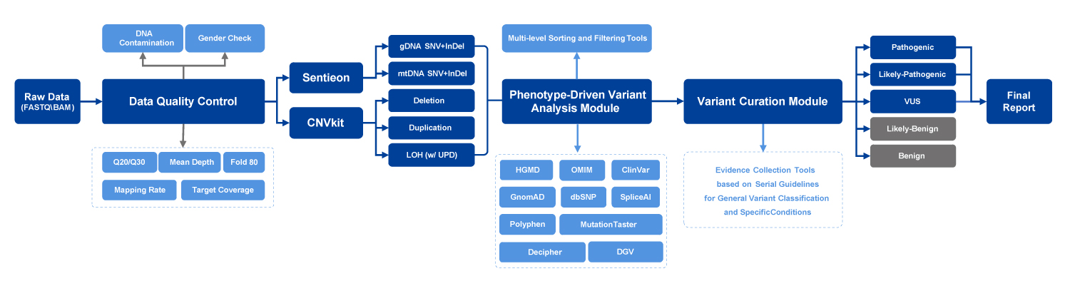The streamlined Germline Variant Analysis System automates key bioinformatics processes — from quality control and sequence alignment to variant calling and functional annotation. It supports both raw sequencing data and VCF file input, and automatically initiates analysis once sequencing is completed, enabling efficient, end-to-end exome data processing. The system accurately detects SNPs, indels, and CNVs, and applies advanced annotation and filtering algorithms to prioritize variants with potential pathogenic relevance.