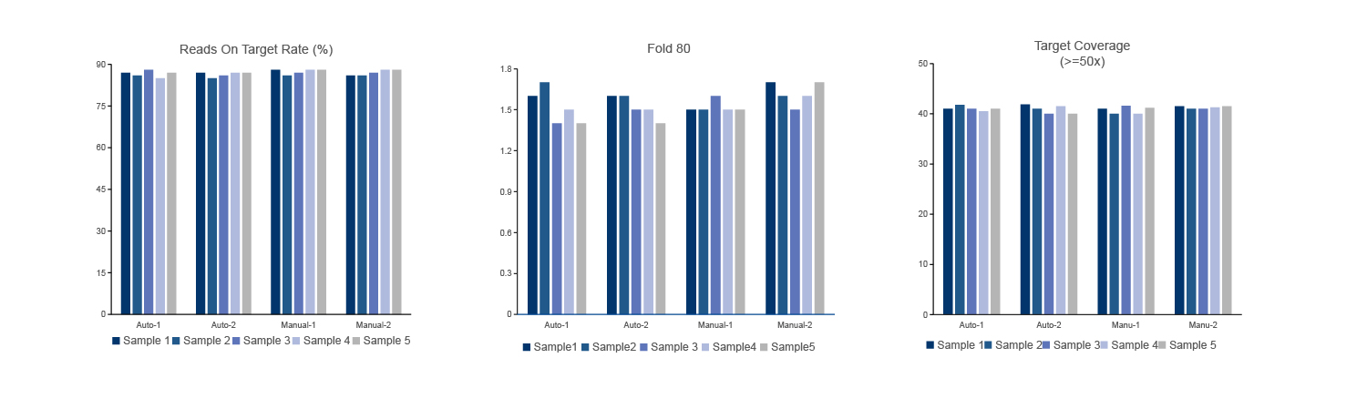 Vazyme’s WES solution demonstrates consistently high performance across both manual and automated workflows, with no significant difference in on-target efficiency or coverage uniformity.